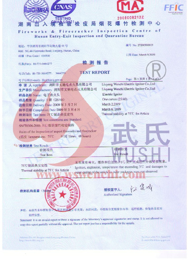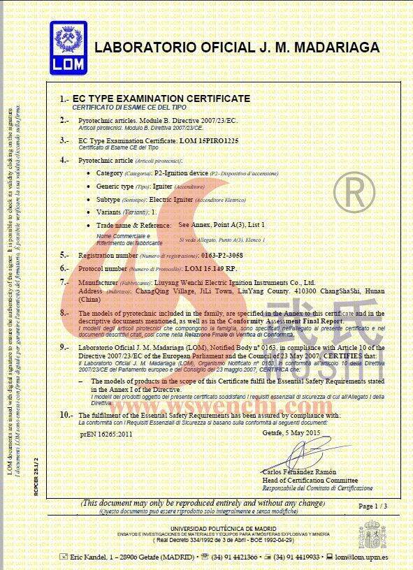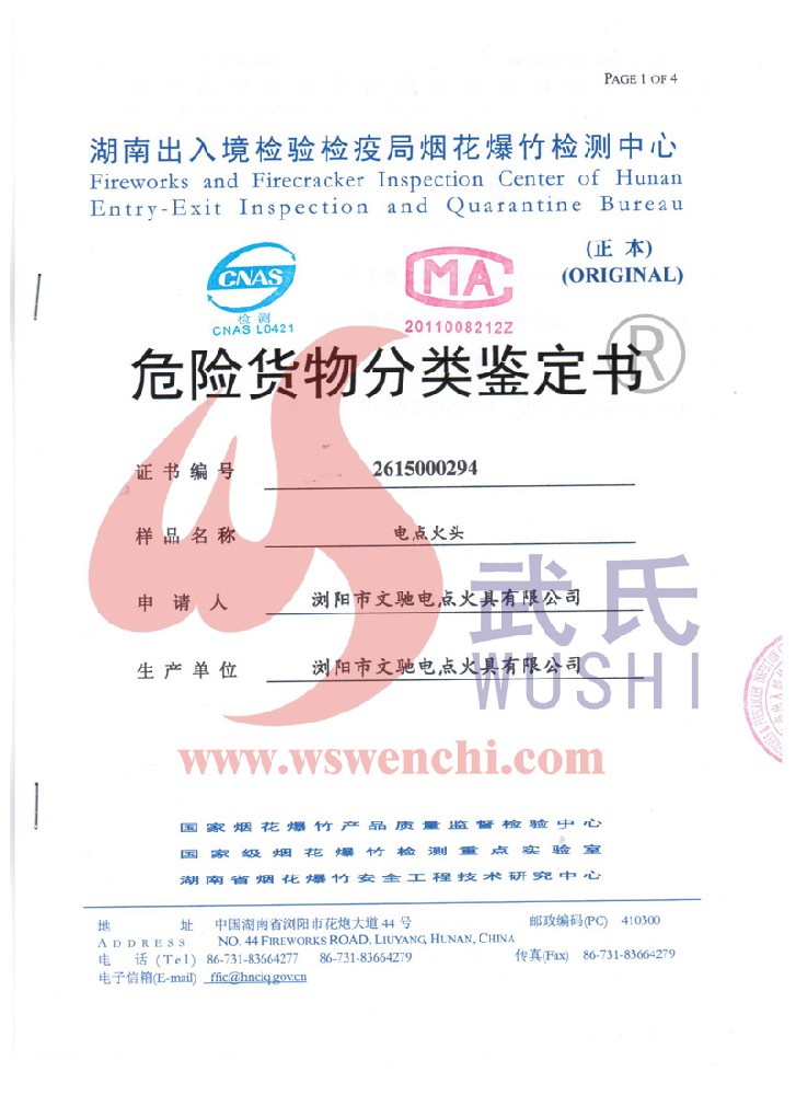 瀏陽市文馳電點火具有限公司(原培文電子點火器材廠),創建于1998年,是一家專業從事研制銷售電子點火產品的民營科技企業,是我國第1枚煙花用電點火頭生產者,是《煙花爆竹電點火頭國標》牽頭起草單位。公司位于中國“煙花之鄉”湖南省瀏陽市,地理位置優(yōu)越,交通便利。 我公司研制的對象是用電能引燃火藥、做機械功等預定功能的一次性使用的元件或裝置,包括電點火頭(英文名ElectricMatch or Electric Igniter,中文俗稱“電火柴”或“電發(fā)火頭”)、電點火管和延期電點火管;我們估且在以后的產品技術欄中將我們研究的產品統稱為電點火具,將電點火器看成是用于提供和控制供給電點火元件點火的電能器材;我們研究的電點火橋路有橋絲式、無橋絲···